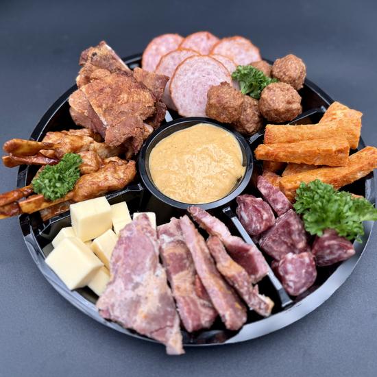 Heerlijke hapjesschaal met c.a. 50 hapjes bestaande uit: Gegrilde kipspiesjes Kaas Blokjes Droge Metworst Satéballetjes Honeypops Gegrilde Speenvarken Cowboyvlees Grillworst Dipsausjes