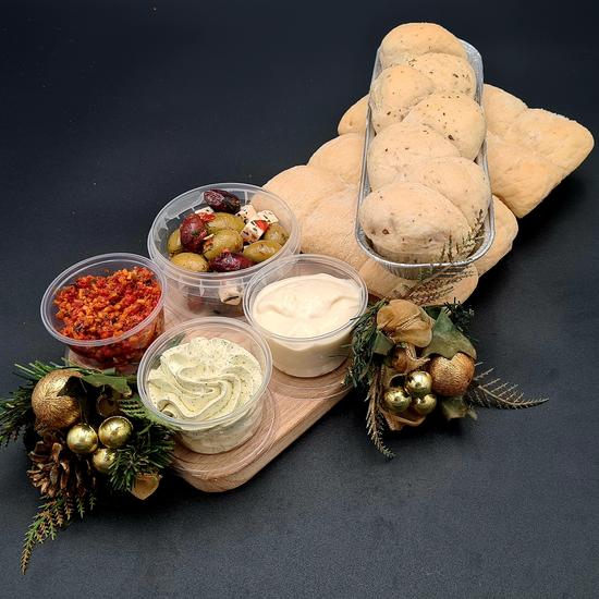 Aïolie, kruidenboter, tapanade, huisgemaakte olijvenmix en 2 verschollende soorten brood en een mooie presentatieplank.