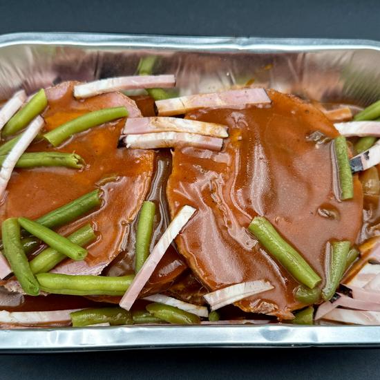 Mooie in plakken gesneden procureurrollade in een bedje van jachtsaus afgemaakt met katespek en haricot verts.