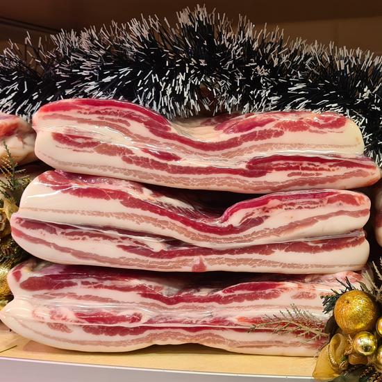 Drooggezouten spek die wij langzaam in onze droogkast hebben laten rijpen. Advies: 500 gram spek voor 1 kilo meel.